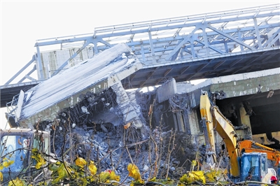记者在现场看到,该建筑主体已经倾斜,墙柱钢筋暴露,现场近10台大型钩机哐当作响。