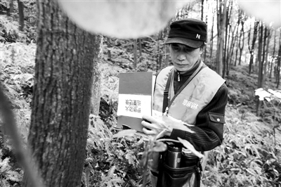 在四川省宜宾市市中心,有一个竹木繁茂的人造城市森林公园,因其四季山色常青被人们称为“翠屏山”。海拔高度500米左右的翠屏山绿化覆盖面积达160公顷,在这密密的山林里长年驻扎着一群护林工,年头最久的已经在这里守护近40年。他们往来穿梭于林间小道,从防火监测到病虫害治理,从防止盗伐名木到环境保护,为守护城市“绿肺”默默奉献。图为一名护林工记录下被蛀虫损害的树木和其位置。 庄歌尔 摄 (新华社发)