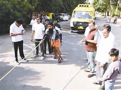 据外媒近日报道,在印度焦特布尔,28岁的大力士卡皮尔用绳子绑在自己的头发上,穿着溜冰鞋拉动一辆将近5000公斤重的黄色大巴前进了120米,打破吉尼斯世界纪录。东方IC 供图