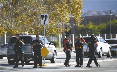 12月2日,在美国加利福尼亚州南部圣贝纳迪诺,警方封锁案发现场附近道路。美国警方2日说,加利福尼亚州南部圣贝纳迪诺当天发生的枪击事件造成至少14人死亡。当地时间上午11时左右,当地警方接到报告,在一家名为“内陆地区中心”的康复中心发生枪击事件。警方和消防等部门人员立即赶到现场采取应急措施。新华社记者 杨磊 摄