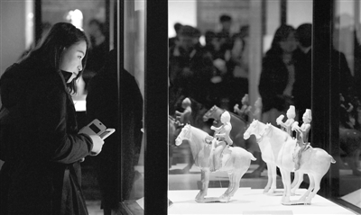 12月4日,观众在台北欣赏河南博物院收藏的唐代三彩骑马持排箫男乐俑。