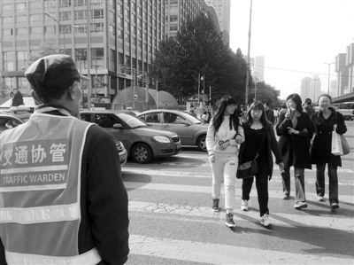在北京,交通拥堵被人诟病。然而,究其原因,与机动车数量增长有关,也与行人遵守交通法规意识不强不无关系。图为北京市CBD一处人行横道。红灯禁行时,等候过马路的行人缺乏耐心,往往聚成一堆儿便闯灯通过,造成机动车通过率降低,成为常年堵点。