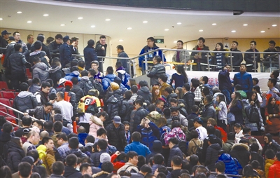 本周三,北京对阵辽宁,在“魔鬼”五棵松体育馆,情绪激动的某北京球迷(左图)以及顶着“压力”助威的辽宁球迷(右图)。本报记者 郎成 摄