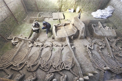 ③12月3日,洛阳市伊川县发现了2500年前的陆浑国贵族墓葬,图为在陪葬车马坑中发掘出的马匹车辆遗骸。图片来源:视觉中国