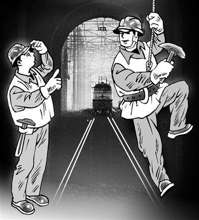 “我们工长可是技术大拿!”完活后,工友们告诉记者,前两年,车间把37座桥梁护轨改造施工任务交给了他们,1480根混凝土枕需要钻孔5920个,而最大的困难是,孔要钻在轨枕头斜坡上,钻头经常跑偏,不是造成整根混凝土枕报废,就是钻头折断,王勇冥思苦想,用角钢焊了个套,一头固定在钢轨上,一头套住钻头,既保证了尺寸的精准,又能防止钻头打斜,班组这才圆满完成了任务。(漫画:法明)