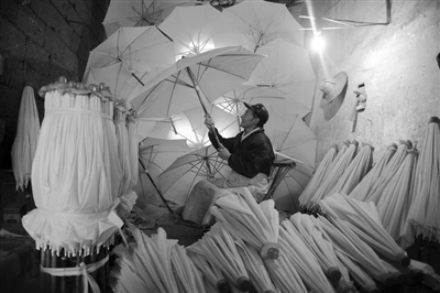 12月3日,在泾县昌桥乡孤峰村国民油布伞厂,工人在制作和检验油伞。