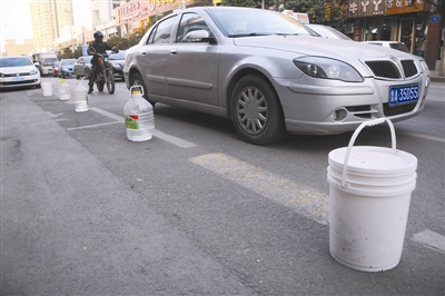 12月4日,在山东济南山师东路上,出现用“水桶排长龙”占车位的现象,吸引了众多路人的眼球。现场,一个个盛有水的透明油桶在马路旁的车位处,挨个排成长队占用车位,成为街头一道独有风景线。陈宁/东方IC