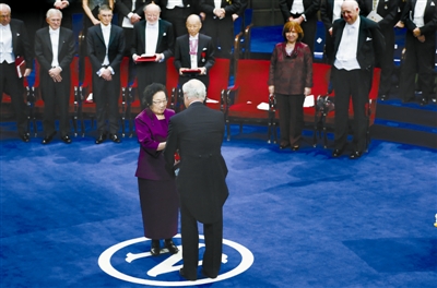 12月10日,在瑞典首都斯德哥尔摩音乐厅举行的2015年诺贝尔奖颁奖仪式上,中国科学家屠呦呦(前左)从瑞典国王卡尔十六世·古斯塔夫手中领取诺贝尔医学奖。