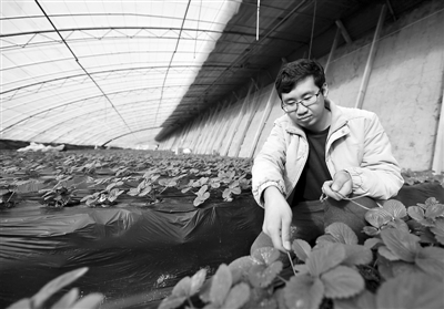 山西农业大学大四学生马红军的蔬菜大棚采用“大行距,小株距”科学栽培方式和“防虫黄板”“以菌治虫”等无害化防虫技术,使果蔬的产量和营养健康都有所保障。图为马红军在大棚查看草莓生长情况。