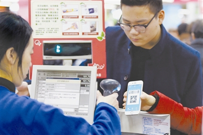 12月12日,杭州市,消费者在使用支付宝扫码进行付款消费。