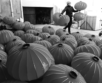 12月15日,在山西省运城市稷山县杨赵村灯笼产业园内,工人在晾晒大红灯笼。