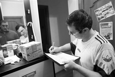 图:一名俄罗斯顾客在莫斯科家中签收京东商城的快递包裹(12月5日摄)。
