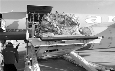 图:在哈尔滨太平国际机场,俄速通公司的工作人员往哈尔滨至叶卡捷琳堡的包机上装货(2013年11月26日摄)。新华社发
