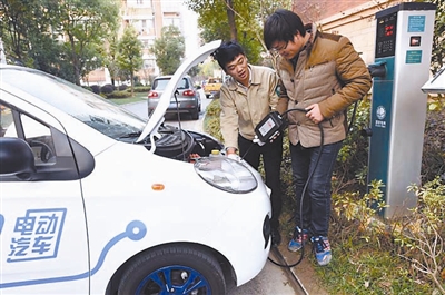 江苏泰州市启动智能用电小区建设,通过智能路由器布置家庭无线网络,除了可以通过智能手机软件控制家中电器,还可对电动汽车充电桩实现远程控制和计费。目前该市已建成智能充电桩130根。图为12月12日,在该市翰林雅居小区,电动汽车车主在工作人员的指导下对电动汽车充电。(红清)