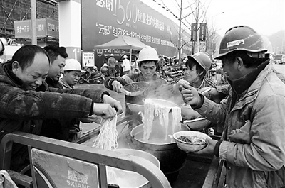 湖北十堰市万达广场建筑工地围墙外, 7元钱的自助餐让农民工吃得开心:“早上上工早,干的是重体力活,饿得快,花样稍多点就吃得特别香。”送饭的小老板说:“中午有5至7个菜,还有菜汤,主食有馒头、花卷和米饭,面条现下现吃,打工都不容易,兄弟能吃饱就好。”