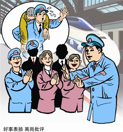 张站长正在进站口帮忙加岗,见小陈汗流浃背地归来,他掏出纸巾为其擦拭额头上的汗珠,说:“下班后参加点名会,车站要对你今天的表现进行讲评!”