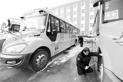 入冬以来,为了应对降温降雪和雾霾天气,青岛校车技术人员对1700余辆校车进行隐患排查,以提高驾驶员的冬季安全行车能力,确保学生乘车安全。图为青岛交运集团即墨分公司的技术人员在检查校车的安全状况。 梁飞 梁孝鹏 摄