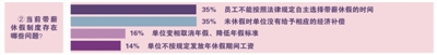 在“当前带薪休假的落实还存在哪些问题”一项调查中,认为“员工不能按照法律规定,自主选择带薪休假的时间”,和“未休假时单位没有给予相应的经济补偿”的受访者最多,均占比35%;16%的受访者反映“单位变相取消年假、降低年假标准”;14%的受访者选择了“单位不按规定发放年休假期间工资”。