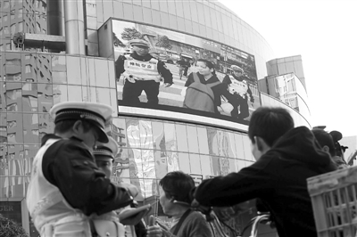 2015年12月15日,广东佛山,禅城交警在多个路段启动“处罚+曝光”工作模式,劝阻闯红灯行人,并用广场大屏幕对不文明交通行为进行曝光。图为禅城交警在百花广场附近路段执法,一女士闯红灯被教育的画面在百花广场大屏幕播放。