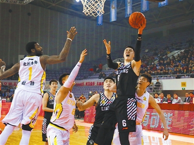 辽宁队球员贺天举(右二)在对阵北控的比赛中上篮得分。 本报记者 郎成 摄