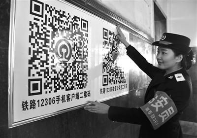 针对新媒体受众多、传播快等特点,南阳车务段利用微博、微信等新媒体平台,为旅客提供更加通畅便捷的服务。12月17日,南阳车站工作人员在候车大厅张贴铁路12306手机客户端及微信公众二维码,方便旅客扫码获取最新出行信息。郭永林 赵向阳 摄