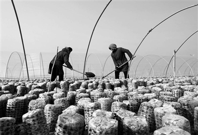 12月22日,山东省枣庄市山亭区店子镇几名妇女在当地枫林食用菌种植基地工作。