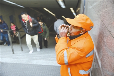 12月18日,西安市小寨地铁出站口,忙完道路上的保洁任务后,63岁的王养刚师傅独自一人吹起了口琴,《闪闪的红星》吹毕之后,又开始了下一曲《三大纪律八项注意》。口琴声响起时,他会闭上眼睛,仿佛陷入对往事的回忆中。
