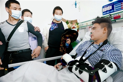 当日,深圳滑坡中被救的幸存者田泽明在病房中与从重庆赶来的父亲田祖龙见面。深圳市光明新区中心医院院长王光明表示,田泽明各项生命体征向好的方向发展,已可半卧坐。 陈文 摄/中新社