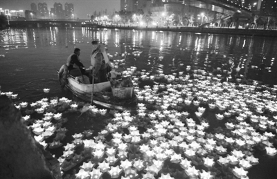 12月23日晚间,河灯活动现场。当日,某公司在成都锦江边举行“10万”河灯放流活动,因所放河灯材质为纸质、铝皮和蜡烛,易造成河水以及河道污染,加上成都本来雾霾就很严重,引起了许多民众以及环保人士质疑。据悉,从2010年起成都就已禁止在公共区域放河灯。东方IC供图