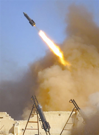 ⑤ 12月21日,叙利亚阿勒颇,叙反对派向阿萨德军事学院发射火箭弹。东方IC供图