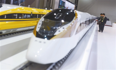 ② 12月4日,在南非约翰内斯堡举行的中非装备制造业展上,两名参观者在中国铁路展台参观中国标准动车组模型。 新华社记者 翟健岚 摄