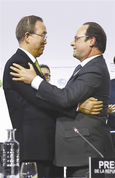 ④ 12月12日,《巴黎协定》通过后,联合国秘书长潘基文和法国总统奥朗德拥抱。东方IC供图