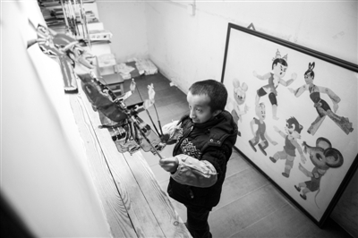 一名袖珍人正在练习皮影戏。 本报记者 王伟伟摄