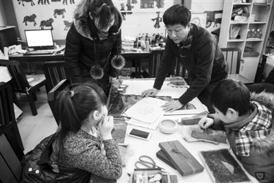 袖珍人正在向皮影老师学习如何刻皮影。本报记者 王伟伟摄