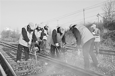 入冬以来,郑州铁路局月山工务段党委针对气温低,安全风险增加的实际,在党员中广泛开展“创岗建区”活动,组织班组党员加强铁路线路设备检查维护和进行技术攻关,及时消除影响运输安全的隐患。图为12月21日,这个段夏店工区的党员在整治设备“病害”。 王占军 摄