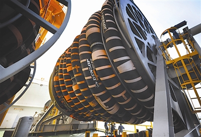 ↓在水深1000多米的海面上产油气,巨大的生产平台就是被这些缆绳牵引着。