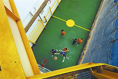 利用午饭后一个小时的时间,队员们在生活平台一角体育锻炼。