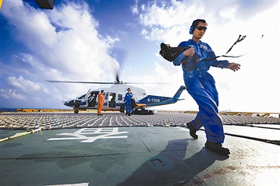 乘坐直升飞机登上南海“奋进号”采油的平台职工。
