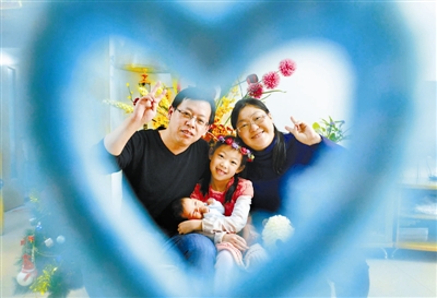 这是2015年12月14日,内蒙古呼和浩特市居民李津(左)、陈丹姝夫妇与9岁的大女儿,刚过满月的二女儿拍摄全家福。夫妻俩都是80后独生子女,李津是工程师,陈丹姝是一名教师。 新华社发 (王正 摄)