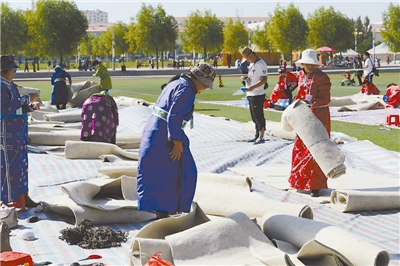 今年8月初,在正蓝旗举办全区蒙古包技能大赛,含比赛和表演赛两个环节。其中比赛项目包含蒙古包安装、绑陶脑、穿哈纳、缝图案、打马鬃绳、蒙古包毡套缝制6个项目;表演赛包括传统手工擀毡子、传统手工拉皮筋和民族柜现场彩绘3个项目。比赛体现地方民族特色,异彩纷呈,受到广泛好评。