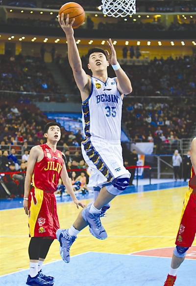 12月27日晚,在CBA常规赛中,北京队主场以128比106主场战胜吉林队。图为北京队张松涛上篮。本报记者 许之丰 摄