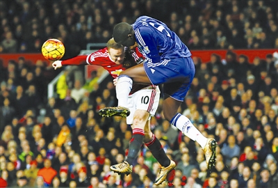 12月28日,在2015/2016赛季英超联赛第19轮比赛中,曼联队主场以0比0战平切尔西队。图为曼联队球员鲁尼(左)在比赛中与对手争顶头球。新华社/路透