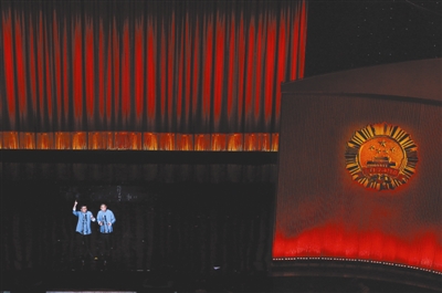 2015年4月26日,“中国梦·劳动美”2015年庆祝“五一”国际劳动节特别节目录制现场, 著名相声演员苗阜和王声表演歌颂劳动者的相声《我要当劳模》。