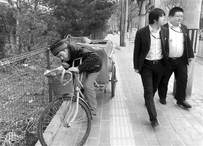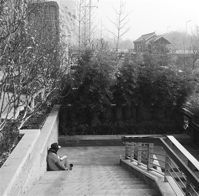 2015年12月21日北京北二环护城河一台阶前,一位环卫工大姐趁着休息的时间在看书。杨登峰 摄