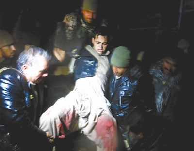 1月3日,在阿富汗北部城市马扎里沙里夫,阿富汗安全人员护送伤者离开袭击现场。阿富汗官员3日说,马扎里沙里夫的印度领事馆当晚遭袭,数名武装分子试图攻入领事馆未果,随后与警方展开交火。