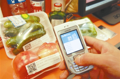 一位工作人员用手机对着超市商品条码扫描,该商品的价格、产地和防伪等信息就立刻显示出来。