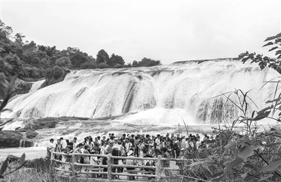 游客在贵州安顺黄果树瀑布景区游玩。(2015年8月10日摄)