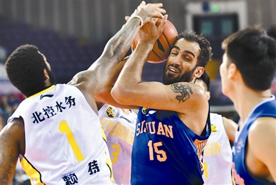 1月6日晚,在CBA第27轮比赛中,北控主场100比113负于四川。图为双方球员拼抢。本报记者 许之丰 摄