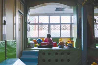 北京市海淀区现代艺术幼儿园是北京市为数不多的实行融合教育的民办幼儿园。幼儿园100多位孩子中有自闭症、唐氏综合症、神经发育迟缓等20多位残疾儿童。图为一名自闭症女孩坐在幼儿园活动室的窗台前。
