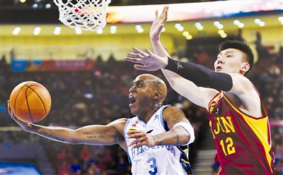 2016年1月10日,在CBA联赛29轮比赛中,北京队以96比76战胜浙江队。图为北京队球员马布里上篮。本报记者 许之丰 摄